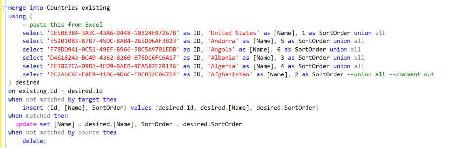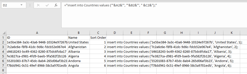 ="select '" & A2 & "' as ID, '" & B2 & "' as Name, " & C2 & " as SortOrder union all"